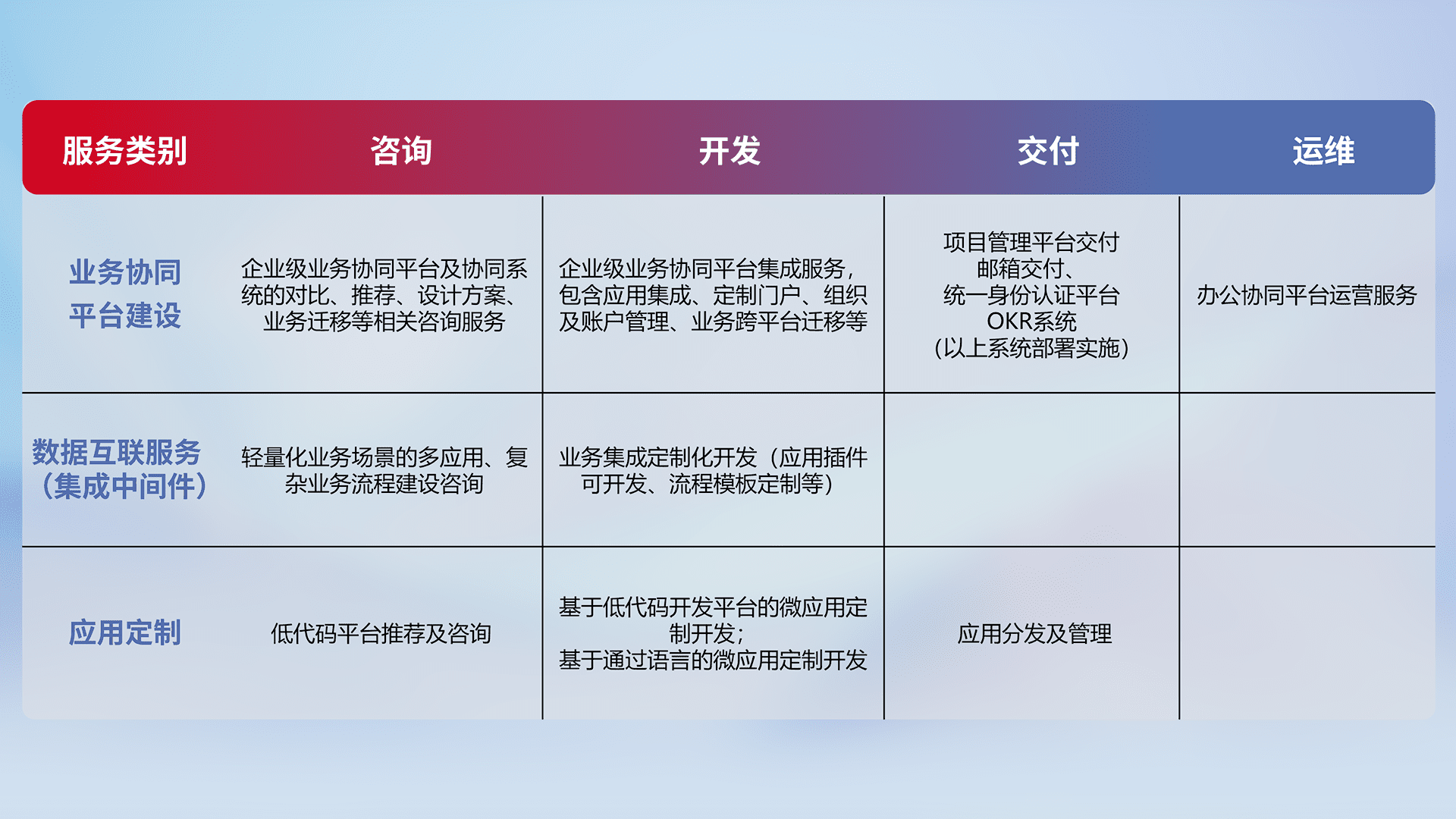 针对钉钉、、、、企微、、IDaas等平台级产品提供产品的规划、、、、方案、、交付、、、、定制化开发等服务,,实现如统一协同办公、、智能客户服务、、、混合会议管理、、智能数据查询、、、等业务场景,,,,实现数字化转型。。。。