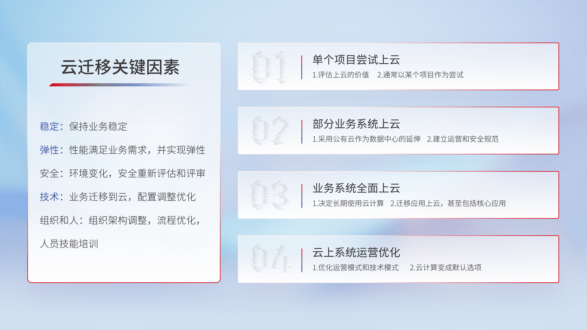 结合实际业务,,,从规划设计、、、云平台选型、、、、云原生改造、、、数据迁移、、、、集成交付,,,迁移全过程为客户识别最佳上云路径,,,,做好风险识别管理,,,设计网络架构、、身份权限、、安全审计合规、、、、操作审计、、、日志审计、、、、监控告警策略、、、多站点容灾设计等,,对云上基础设施进行整体规划,,提升IT治理水平,,,以满足弹性、、、、高可用、、、高性能的需求。。。。