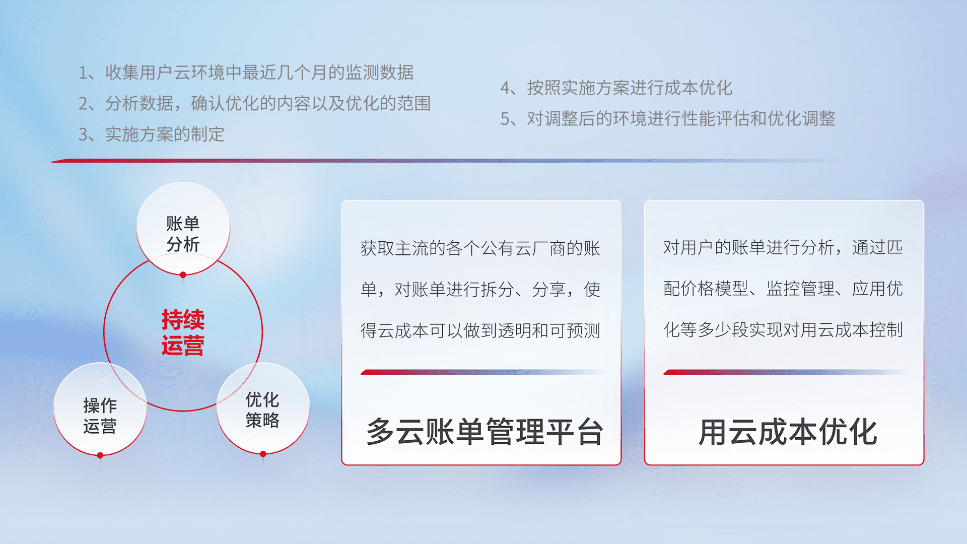 通过多云纳管,,以统一的资源数据模型把客户的云资源进行抽象和封装,,进而实现对多云资源的统一操作,,,保障云资源管理的可靠性、、稳定性与可用性。。。量身定制化运维内容,,,配置、、开发运维、、、补丁管理、、、备份、、、、监控、、、认证和访问管理、、、、审计和日常巡检等,,,,保障在用云过程中的可靠度,,,稳定度以及高可用率。。。